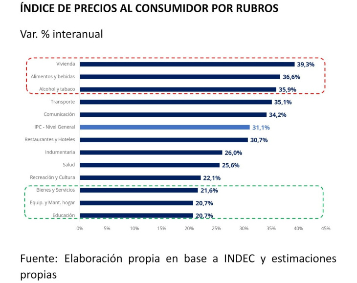 Durante el año, la inflación anual se ubicó en torno al 31,1%, aunque no todos los rubros evolucionaron al mismo ritmo. Teniendo en cuenta el comportamiento heterogéneo mencionado, podemos destacar los rubros que sufrieron el mayor incremento interanual: Vivienda (+39,3%), Alimentos y bebidas (+36,6%) y Alcohol y tabaco (+35,9%), todos por encima del nivel general. En contraste, Educación (+20,7%), Equipamiento y mantenimiento del hogar (+20,7%) y Bienes y servicios (+21,6%) mostraron aumentos considerablemente más moderados.