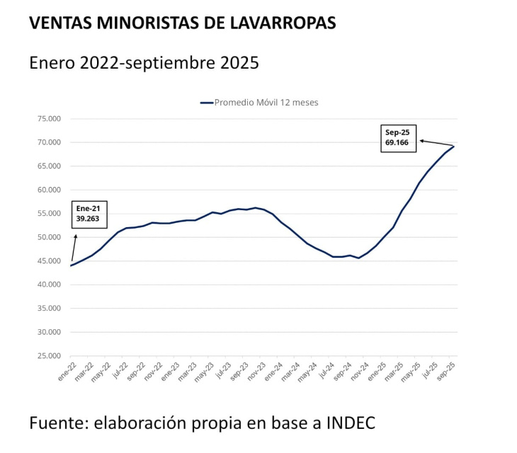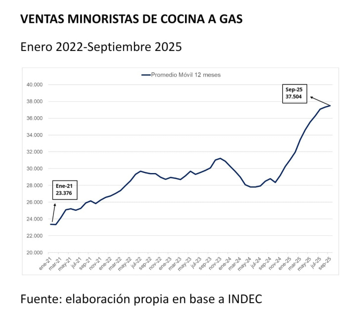 Desde la óptica del consumo, los datos de ventas minoristas aportan una señal relevante. Tras una fuerte contracción hacia fines de 2023 y durante buena parte de 2024, el consumo de bienes durables comenzó a recuperarse de manera sostenida a partir del último trimestre de 2024 y a lo largo de 2025. Electrodomésticos como lavarropas y cocinas a gas registraron aumentos significativos en las cantidades vendidas, con cambios claros en la tendencia y niveles máximos en varios años.